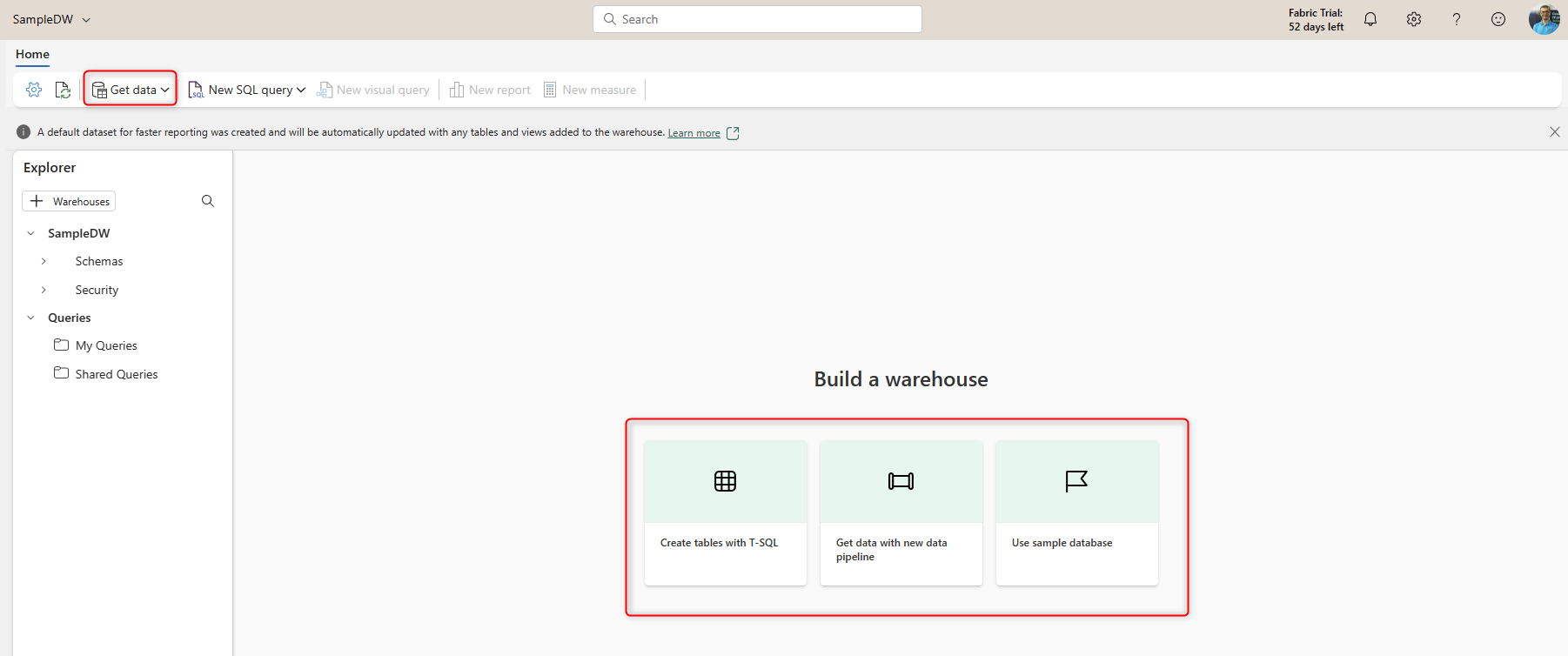 You can load the data into the Warehouse using Data Pipelines or writing SQL code. There is also an option to use a sample database, which I am using here. The sample data will have some tables preloaded and ready for work.