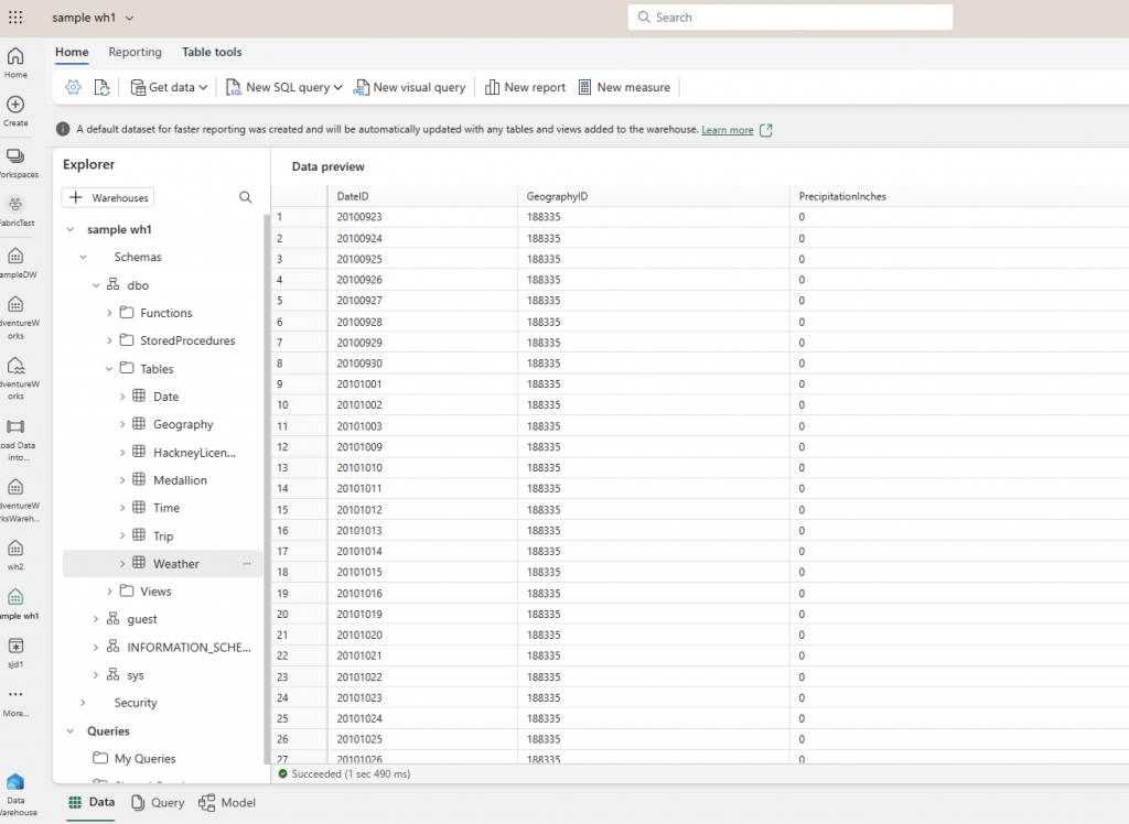 Sample data loaded into the Warehouse.
