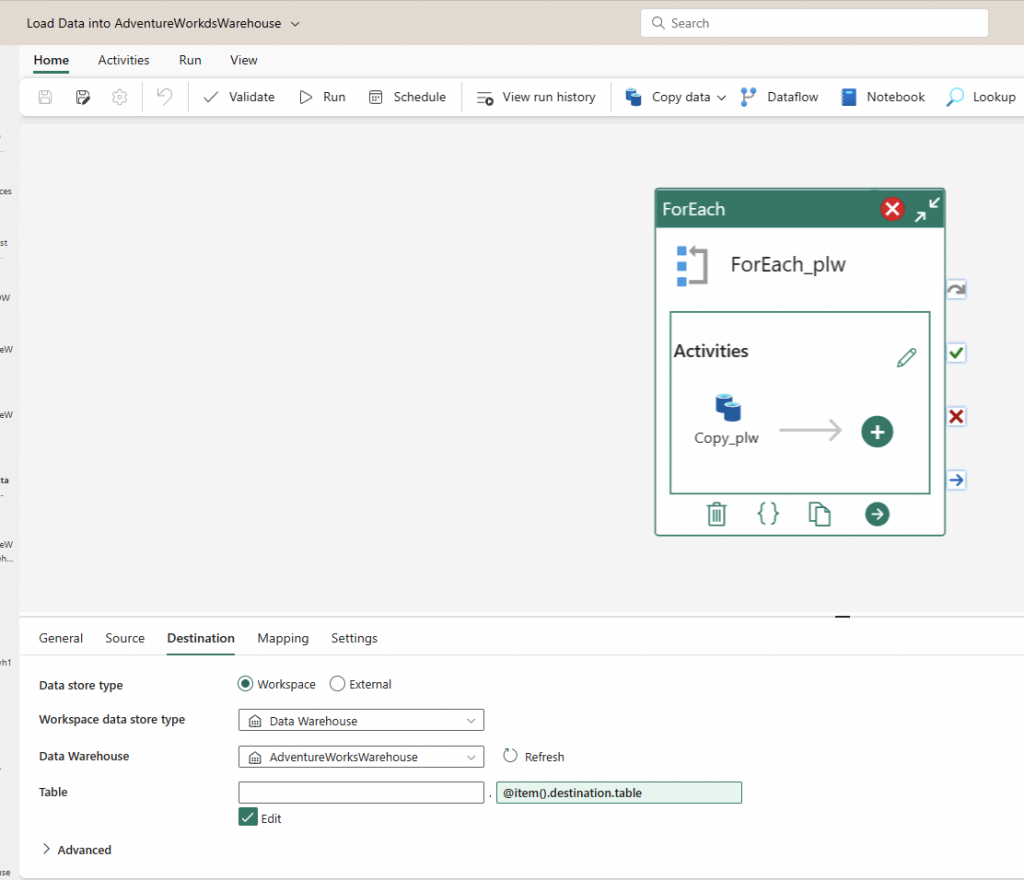 Loading data into the Warehouse using Data Factory Pipeline and the Copy data activity