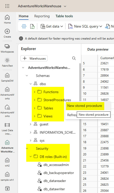 In the Warehouse Explorer, you can explore the data and create database objects such as Stored Procedures, functions, and views. You can also specify security specifications.