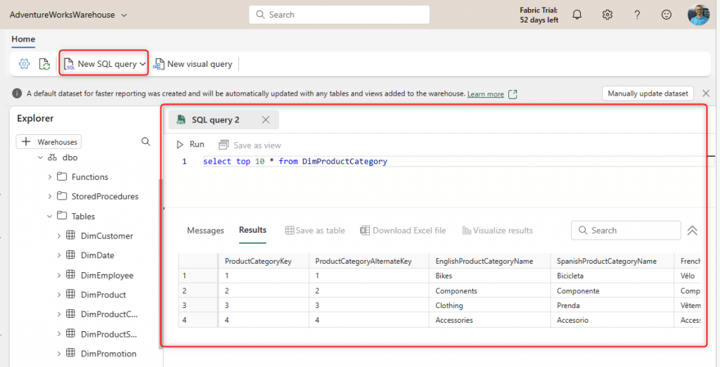 • SQL query (run either in the Warehouse Explorer or in other tools such as SQL Server Management Studio)