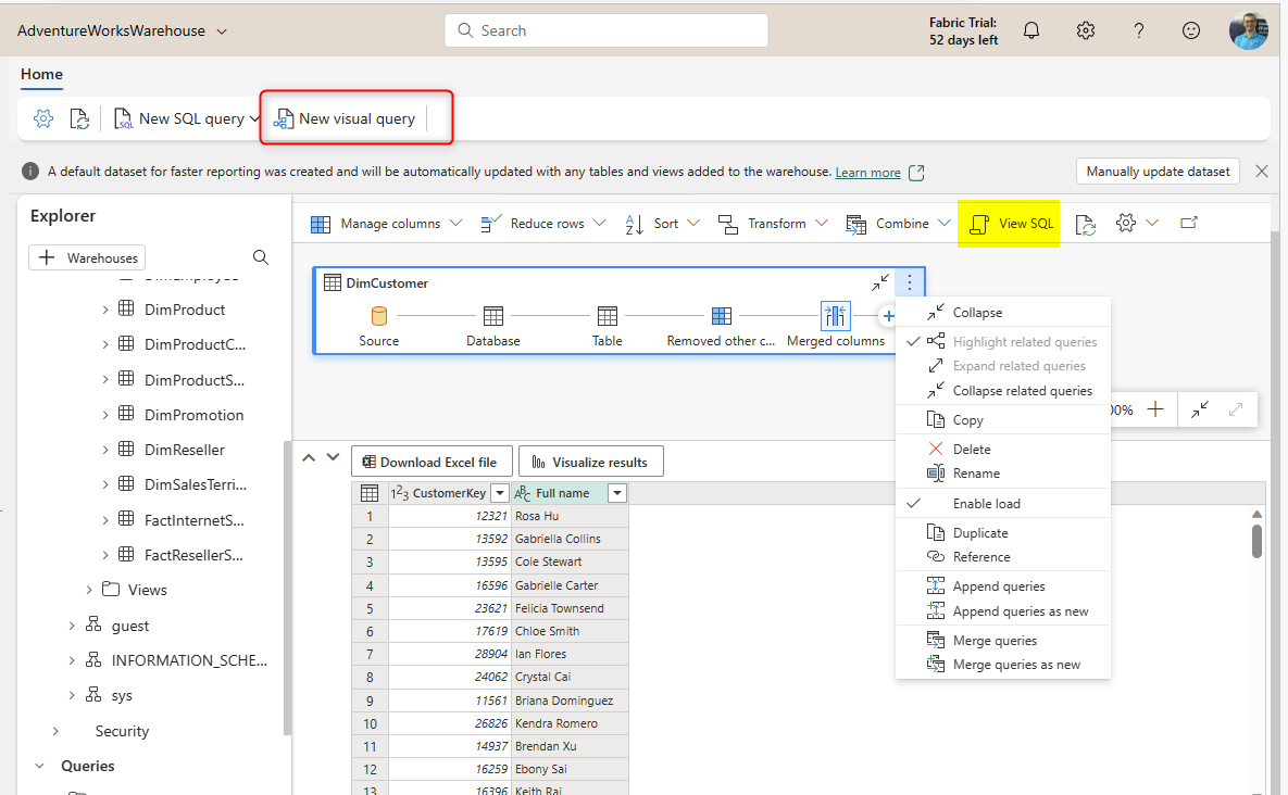 Creating Visual Query for the Microsoft Fabric Warehouse