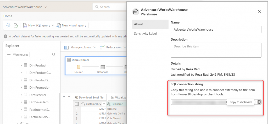 Getting the SQL connection string for the Microsoft Fabric Warehouse