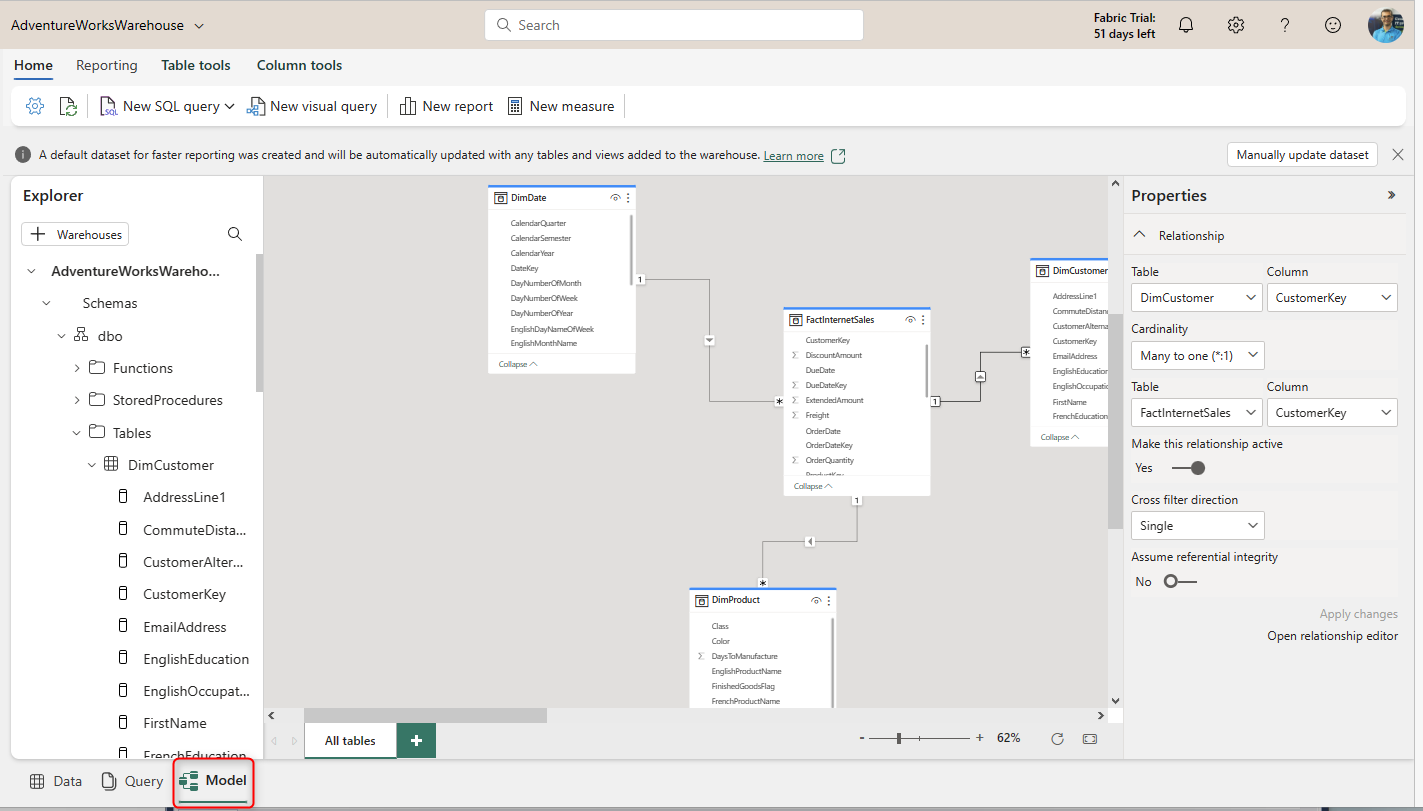 This Power BI Dataset can be modified using the Warehouse Explorer in the Model tab.