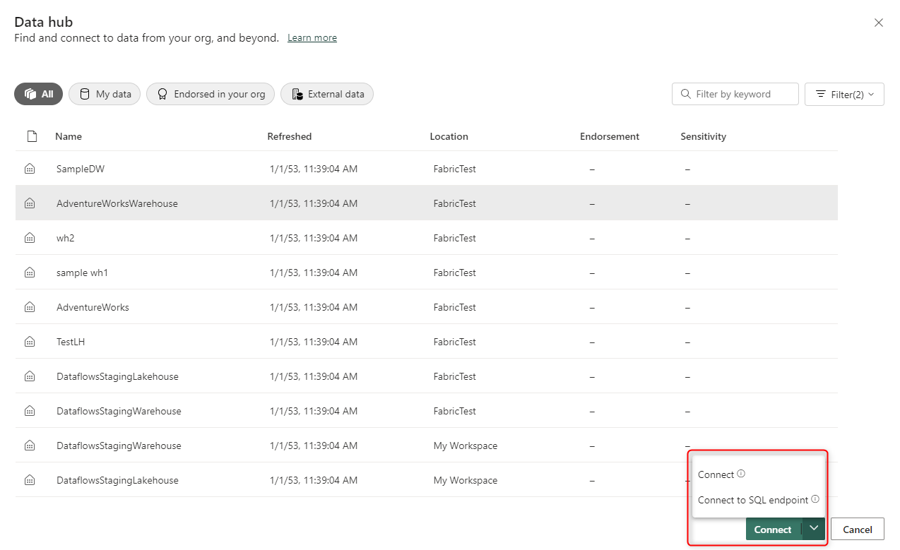 Get data from the Warehouse options in the Power BI Desktop