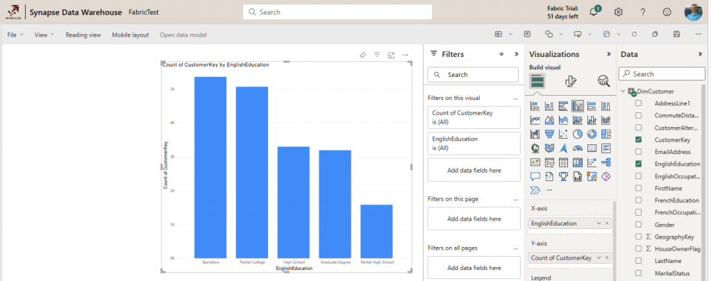 You notice that the screenshot has Synapse Data Warehouse in the header. That is because Azure Synapse is the component behind the scene responsible for the Data Warehousing workload in Fabric.